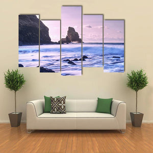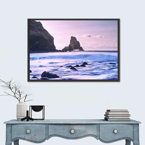 Talisker Bay, Scotland is shown in this photographic landscape of ocean, coastal cliffs and sea stacks. Soft purples and deep blues, together with long-exposure water motion and a cloudy sky, create a tranquil, atmospheric scene. It fits well in modern or coastal rooms looking for calm, nature-focused wall art.