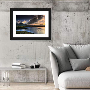 Capture the serene beauty of the Isle of Skye with this striking canvas print. Featuring a stunning landscape of lakes, mountains, and dramatic clouds illuminated by sunset, this artwork brings a sense of calm and epic wonder to your space.
