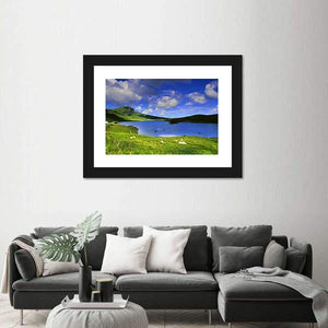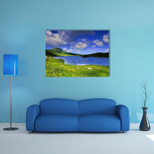 Capture the serene beauty of the Isle of Skye with this stunning canvas art. Featuring a peaceful landscape of lakes, mountains, and fluffy white sheep amidst soft clouds, this piece brings a calming atmosphere to any space.