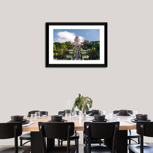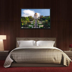 This canvas depicts the Baháʼí World Centre terraces with the golden dome framed by palm trees, stone steps and white balustrades. The symmetrical, linear perspective and a palette of green, white, blue and gold give the scene a serene, majestic mood that works well in living rooms, entryways or quiet corners.