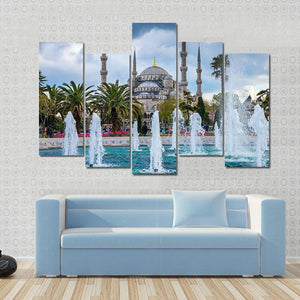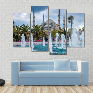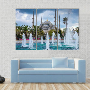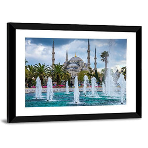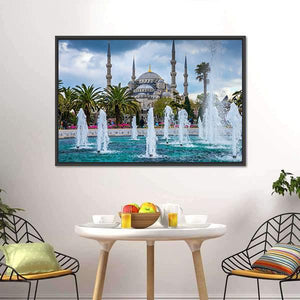 This canvas art captures the majestic Sultan Ahmed Mosque surrounded by vibrant fountains and palm trees, set against a serene cloudy sky. Its rich blue and green palette brings a sense of tranquility to any space.
