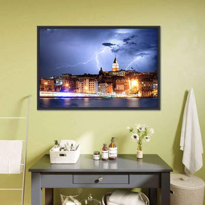This canvas features a dramatic city skyline of Istanbul illuminated by lightning, showcasing the iconic Galata Tower against a stormy backdrop. The vibrant palette of blue, yellow, and white captures the energy of a stormy night, making it a striking addition to your wall decor.