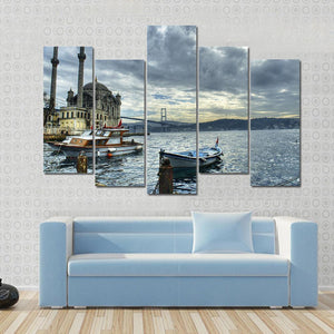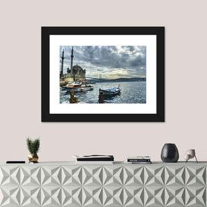 This canvas artwork captures the stunning Ortakoy Mosque, set against a serene, cloudy sky. Featuring a photorealistic style, it showcases two minarets and boats gently docked on the water, perfect for bringing calmness to your space.