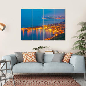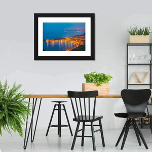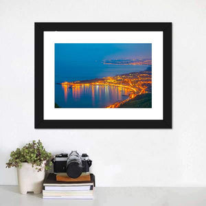This captivating artwork showcases a serene coastal city at night, illuminated by vibrant lights that reflect on the water. With a stunning aerial perspective, it beautifully captures the essence of Italy's charming coastline, making it a perfect addition to your wall decor.