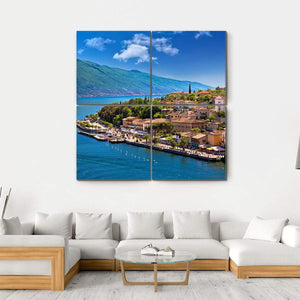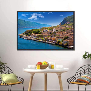 Experience the beauty of Limone Sul Garda with this vibrant canvas wall art. Depicting a picturesque lake town nestled against mountains, it captures the essence of sunny days with boats docked by the waterfront and a charming church steeple under a clear sky.