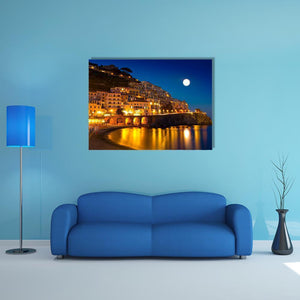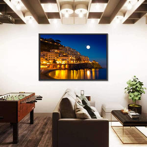 This canvas art captures a serene night view of a coastal town illuminated by a full moon. The calming blues and soft yellows reflect off the water, creating a peaceful ambiance perfect for any room.
