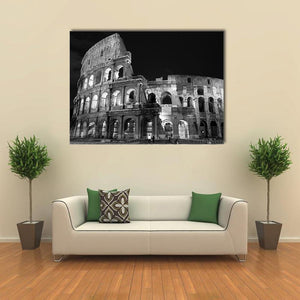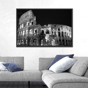 This striking canvas captures the historic Colosseum in Rome under nighttime lighting. With a dramatic palette of black, white, and gray, it highlights the ancient architecture’s arched structures and stone facade, inviting a sense of grandeur to any space.
