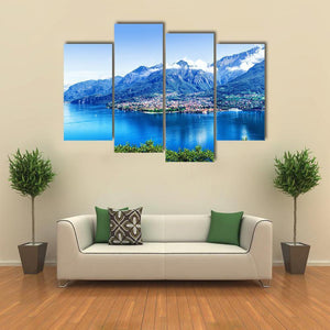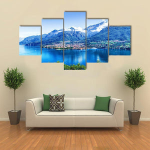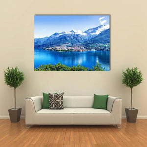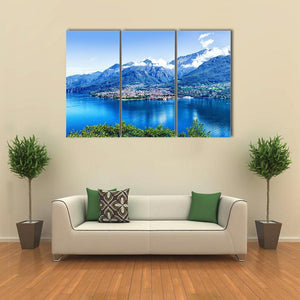 Panorama Of Como Lake captures a serene lakeside town framed by mountains, with clear reflections on the water and clouds along the peaks. Rendered in blues, greens, white and brown and composed for depth, this bright, expansive landscape makes a calm statement for home wall decor and modern rooms.