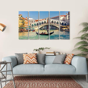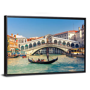 This stunning canvas art captures the iconic Rialto Bridge in Venice, set against a clear, sunny sky. The vibrant colors of the blue canal and green surroundings evoke a sense of adventure in this historic setting, making it a captivating addition to any wall.