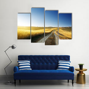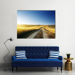 This canvas wall art captures a serene dirt road winding through rolling hills, bathed in the warm glow of a Tuscan sunset. With a palette of golden fields and a clear blue sky, it brings a peaceful atmosphere to any space.