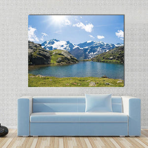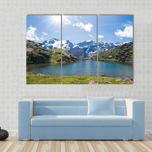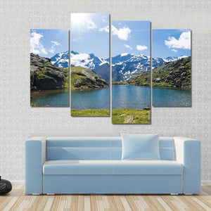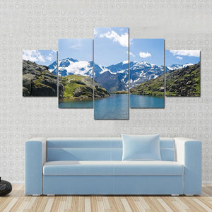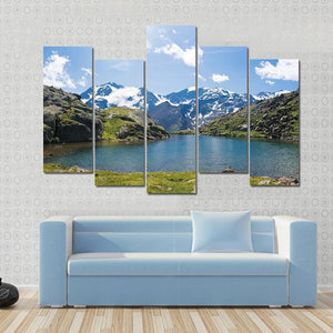 This landscape artwork captures a serene mountain lake in Italy, surrounded by snow-capped mountains and a rocky shoreline. The bright blue sky and fluffy clouds enhance its majestic atmosphere, making it a lovely addition to any nature-inspired décor.