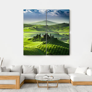 This canvas wall art captures the serene beauty of rolling hills, cypress trees, and vineyards under a radiant sunrise. The idyllic scene evokes a rustic charm, perfect for adding a peaceful touch to your home decor.