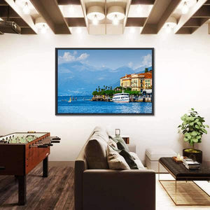 A photorealistic view of Lake Como shows a calm daytime scene: a boat docked beside lakeside buildings with snow-capped mountains beyond. The blue-green palette and rule-of-thirds composition create a serene mood that fits modern home living areas.
