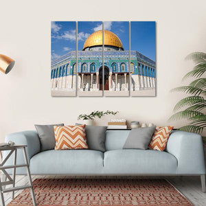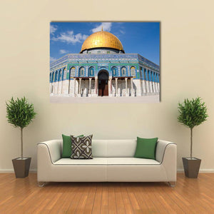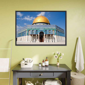 This canvas art captures the majestic Dome of the Rock in Jerusalem, showcasing its iconic golden dome and beautiful blue tiled facade. The serene atmosphere is enhanced by the blue sky and soft clouds, making it a stunning piece for lovers of architecture and history.