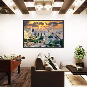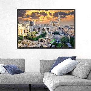 Tower Of David in Jerusalem captures the citadel’s tower and ancient stone arches at sunset, shown in a photorealistic approach. The print carries a historical, serene, awe-inspiring feel, making a calm focal point for modern or classic interiors.