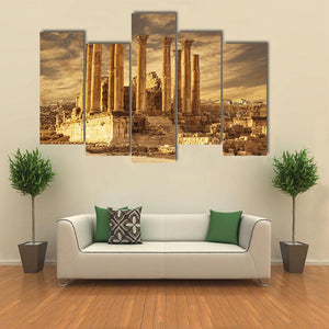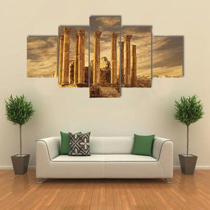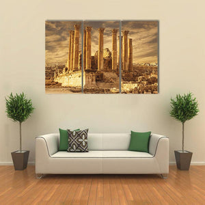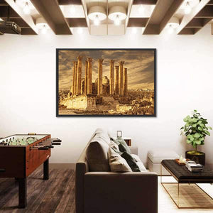 This canvas artwork captures the grandeur of the ancient Temple of Artemis in Jordan, showcasing its tall stone columns and crumbling stonework under a dramatic cloudy sky. With a palette of earth tones, brown, and hints of gold, it evokes a historic and atmospheric vibe suitable for any wall decor.