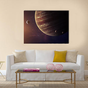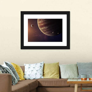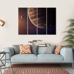 This captivating piece presents Jupiter surrounded by its moons, showcasing a cosmic scene filled with swirling clouds, distant stars, and nebulae. The rich palette of browns, oranges, and purples evokes a sense of awe, making it an inviting addition to any modern space.