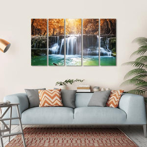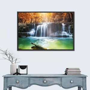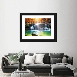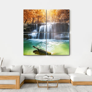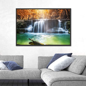 This vibrant canvas art captures a serene waterfall surrounded by lush trees and a log, evoking the natural beauty of a tropical rainforest in Thailand. With sunlight filtering through the leaves, it brings a calming atmosphere to any space.