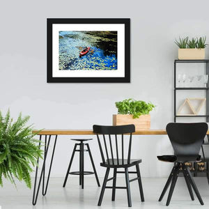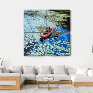 This peaceful canvas art captures a kayaker paddling through vibrant water lilies on a serene lake. The rich palette of blues, greens, reds, and yellows brings a lively atmosphere to any space.