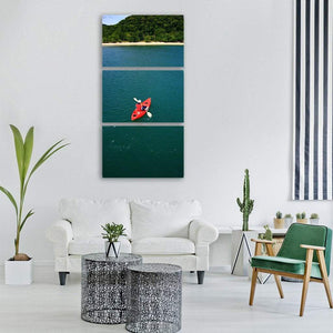 Aerial-view landscape of a kayaker paddling a red kayak beside a green, forested island in bright blue ocean. The rule-of-thirds composition feels serene, adventurous, and vibrant. A modern canvas print that suits contemporary room decor.