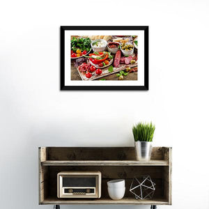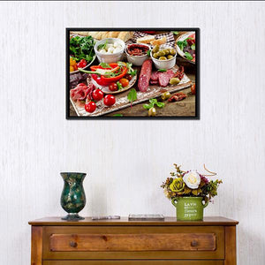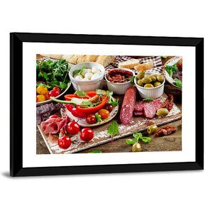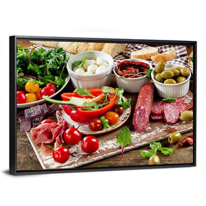 Bring the joy of an Italian food spread into your space with this vibrant canvas wall art featuring a colorful charcuterie board. The appetizing display of olives, cured meats, and fresh produce makes it a delightful addition to your kitchen or dining area.