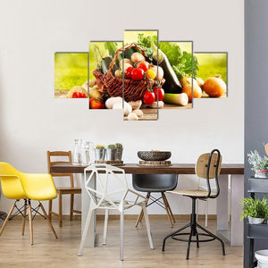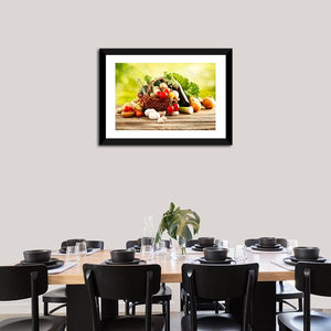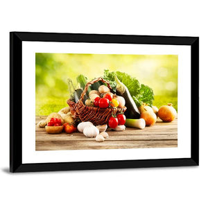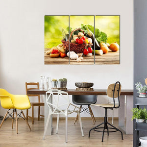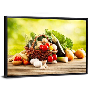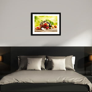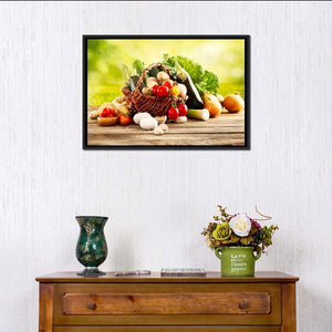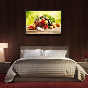 This vibrant canvas features a delightful basket of fresh vegetables, including eggplant, tomatoes, garlic, onions, and lettuce. The photorealistic design and warm colors create a wholesome, inviting atmosphere.
