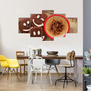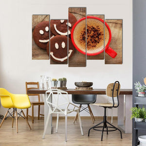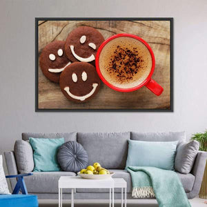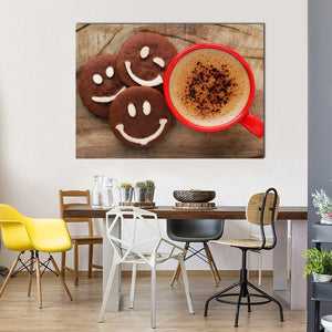 This cheerful canvas features a playful scene of a coffee cup alongside smiling cookies, inviting warmth into your space. The close-up, overhead shot showcases rich browns, whites, and reds, perfect for adding a touch of modern charm to your kitchen or dining area.