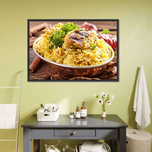 Close-up, realistic canvas print of chicken biryani in a copper bowl, topped with parsley and accented by star anise and cinnamon sticks. Warm yellow and brown tones give an appetizing, inviting mood that suits kitchens, dining areas, or restaurant walls. The close composition highlights rice, chicken, and garnish for a food-focused piece.