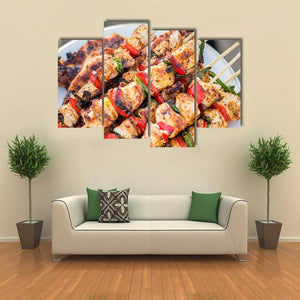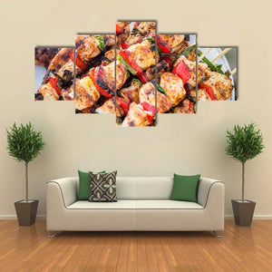 Close-up canvas print of barbeque chicken skewers with visible char marks, juicy grilled meat, bell peppers and onions in a palette of reds, greens, browns and white. The realistic food-photography look creates an appetizing, savory mood that suits kitchens, dining areas, or restaurant walls.