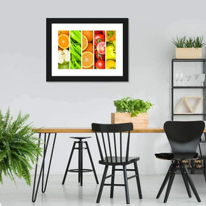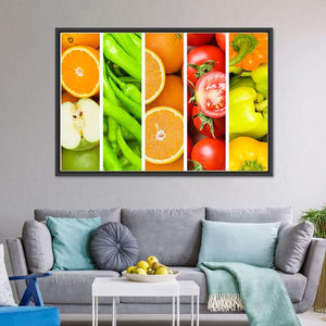 This vibrant canvas art showcases a collage of fruits and vegetables, including sliced oranges, tomatoes, and chili peppers, creating a lively and fresh atmosphere. Ideal for adding a pop of color to your kitchen or dining area.