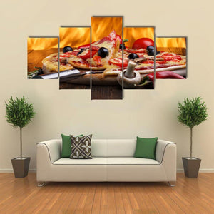 Hot Pizza With Oven Fire Canvas Wall Art presents a photorealistic close-up of a hot pizza slice with melted cheese, olives, peppers, mushrooms, tomato and a pizza cutter set against oven flames. The image reads warm, appetizing and rustic. It works well in kitchens, dining rooms, or restaurant walls as food-focused modern canvas art.