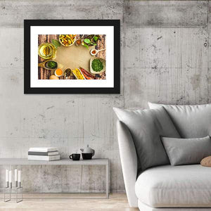 This canvas artfeatures an overhead view of tricolor rotini pasta, spices, and herbs, arranged in a circular, organized fashion. Perfect for culinary enthusiasts, it brings a fresh and rustic touch to your kitchen or dining area.
