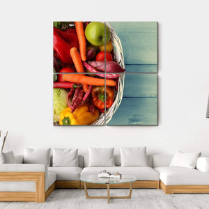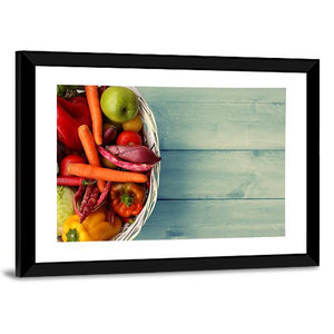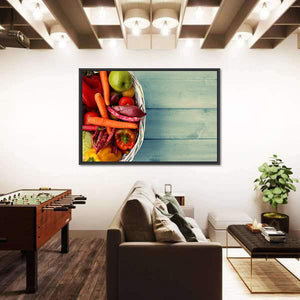 This vibrant canvas art features a close-up of a wicker basket filled with fresh vegetables like carrots, peppers, and cabbage. The colorful palette evokes a healthy, inviting atmosphere, perfect for adding a touch of nature to your kitchen or dining area.
