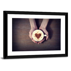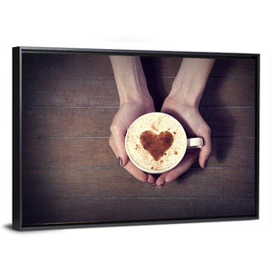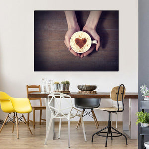 This artwork depicts a warm and loving moment as hands gently cradle a coffee cup, adorned with beautiful cinnamon art on the foam. The artistic, minimalist style captures a cozy atmosphere, making it a charming addition to your room decor.