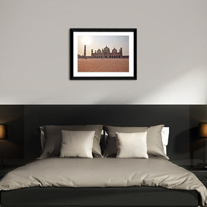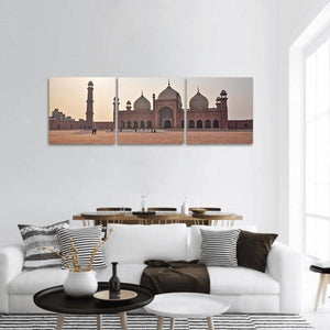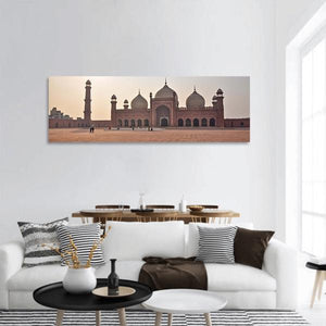 Capture the scale and calm of Lahore’s Badshahi Mosque with this panoramic canvas, rendered in photorealistic detail. The wide, symmetrical composition highlights reddish-brown brick domes, arched windows, and tall minarets, creating a grand, serene presence that suits both traditional and modern room decor.