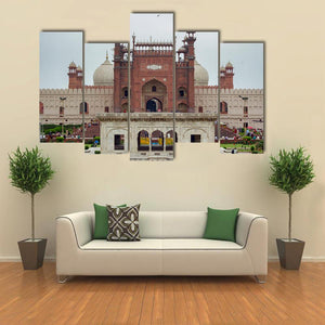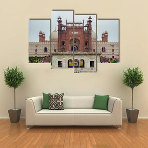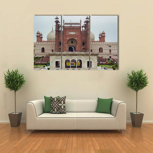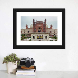 Featuring the Badshahi Mosque in Lahore, this canvas art showcases its grand architecture with ornate red facades and majestic domes. The serene scene captures people walking on the stairs, adding life to its historic presence.