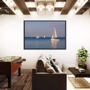 A photorealistic canvas print of Lake Balaton showing sailboats on open water beneath a blue, white and grey sky. Rule-of-thirds composition puts a large sailboat in the foreground with several smaller boats in the distance, giving the scene a calm, serene, peaceful feel. Suits modern living spaces or nautical-themed rooms.