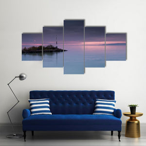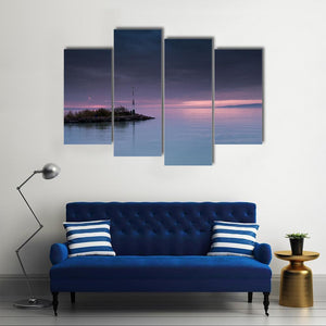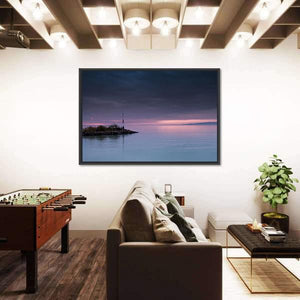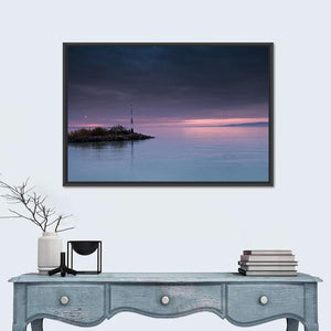 This canvas wall art captures a serene sunset over Lake Balaton, showcasing tranquil waters, a silhouette of an island, and a tall structure against a backdrop of stormy clouds. Its calm, twilight mood makes it a beautiful addition to any modern decor.