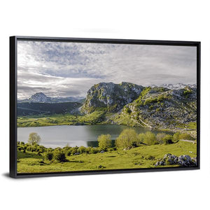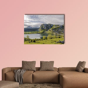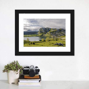 Lake Enol shows a realistic landscape of a calm lake framed by green hills, trees and rocky mountain peaks beneath a cloud-filled sky. The green, blue, gray and white palette creates a serene, natural mood, and the rule-of-thirds composition draws attention to the lake’s reflection. Works well in modern or nature-inspired rooms.