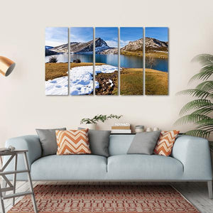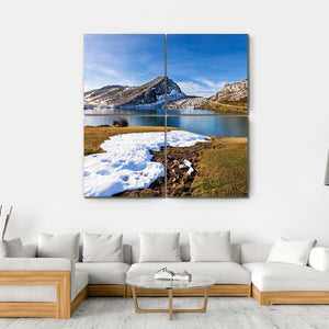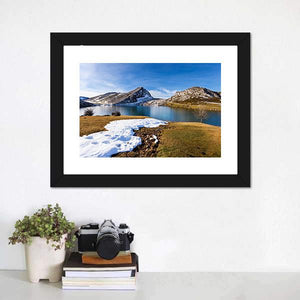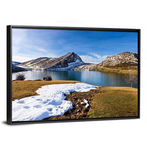 This canvas artwork captures the serene beauty of Lake Enol in winter, showcasing a panoramic view of a mountain landscape with a snowy ground. The precise details, from patches of melting snow to a clear blue sky dotted with wispy clouds, evoke a crisp and bright atmosphere.