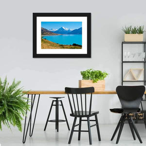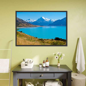 Lake Pukaki in New Zealand appears here as a realistic landscape: vivid turquoise water, snow-capped mountains, and golden grassy hills beneath a bright blue sky. The daytime scene feels serene and majestic with clear depth and rule-of-thirds composition. Suits modern living rooms or house spaces with a nature-focused palette.
