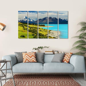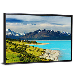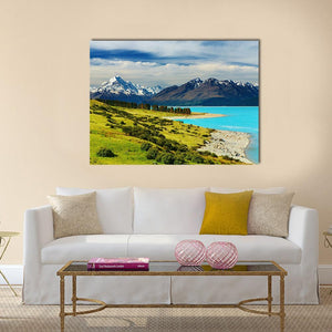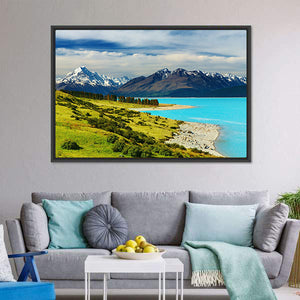 This canvas art features the majestic Mount Cook alongside the serene Pukaki Lake, showcasing snow-capped mountains and a vibrant blue lake. The rich greens of the rolling hills and scattered trees create a tranquil atmosphere, perfect for enhancing your living space.