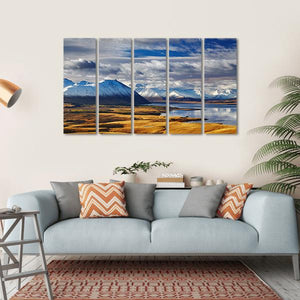This canvas art beautifully captures the serene landscape of New Zealand's Southern Alps. Snow-capped mountains rise above golden fields and a tranquil lake under dramatic clouds, offering a stunning view that evokes a sense of vastness and peace.