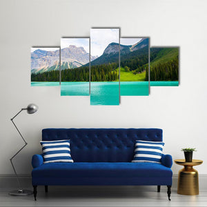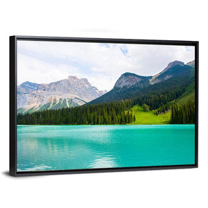Emerald Lake Canvas Wall Art shows a mountain landscape with a turquoise lake, pine forest, and rocky peaks beneath a partly cloudy sky. The blue-green and gray palette and rule-of-thirds composition create a calm, majestic mood that works well with modern home decor.
