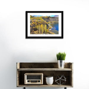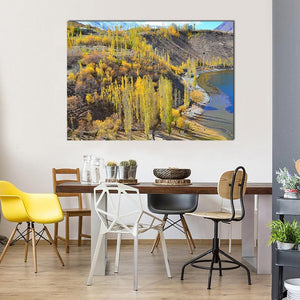 Experience the serene beauty of autumn with this canvas wall art featuring tall trees beside a calm lake. The vibrant colors of yellow, green, and blue evoke a natural atmosphere perfect for any space.