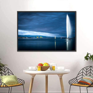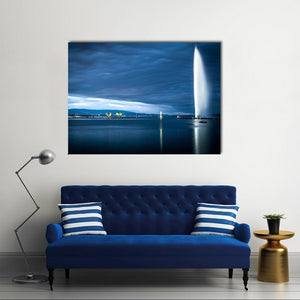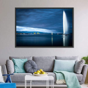 This modern canvas art features a stunning fountain amidst a serene lake and city skyline, captured under a dramatic evening sky. Its calming palette of blues and whites creates a tranquil atmosphere that complements various décor styles.