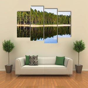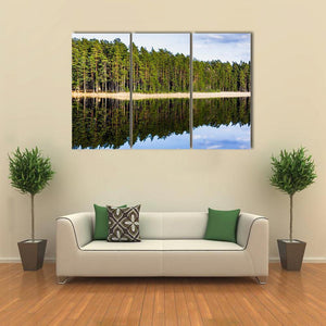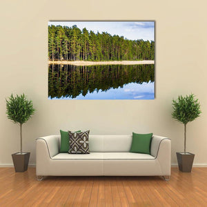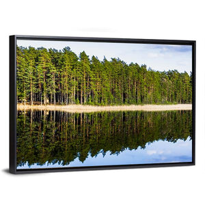A peaceful, realistic landscape of a footbridge beside a calm lake, reflected on the water and framed by tall evergreen trees under a partly cloudy sky. Soft greens, blues and browns create a tranquil atmosphere that works well in modern or nature-inspired rooms.