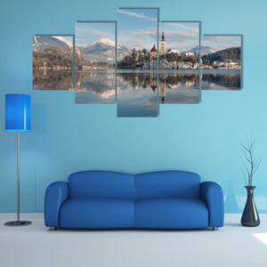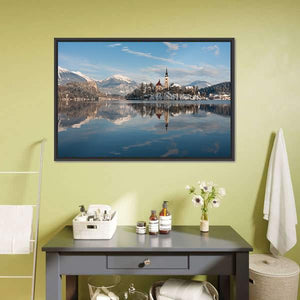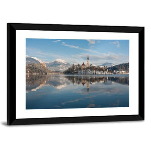 This captivating piece features a serene landscape of Lake Bled with a charming island church set against snowy mountains. Its realistic style and peaceful palette of blues, whites, and greens create a tranquil atmosphere.