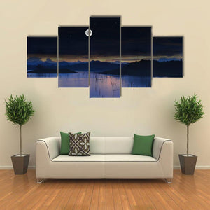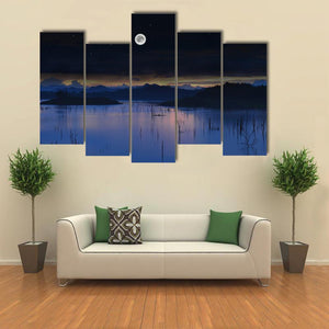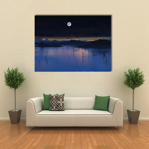Moonlit lake with a full moon, bare tree branches emerging from the water, and distant mountains beneath a clear, starry night sky. Rendered in deep blues, black and white with a realistic, atmospheric approach, it gives a calm, mysterious mood that suits modern or nature-inspired rooms.