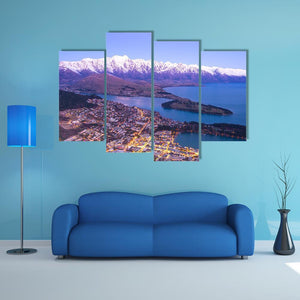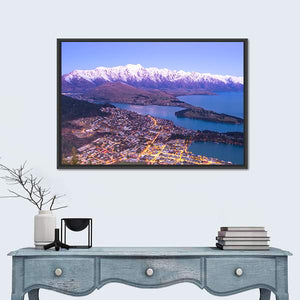 This canvas art captures the serene beauty of Queenstown, showcasing a stunning lake surrounded by majestic snow-capped mountains and a vibrant town. The photorealistic style and rich colors create a lively yet tranquil atmosphere.